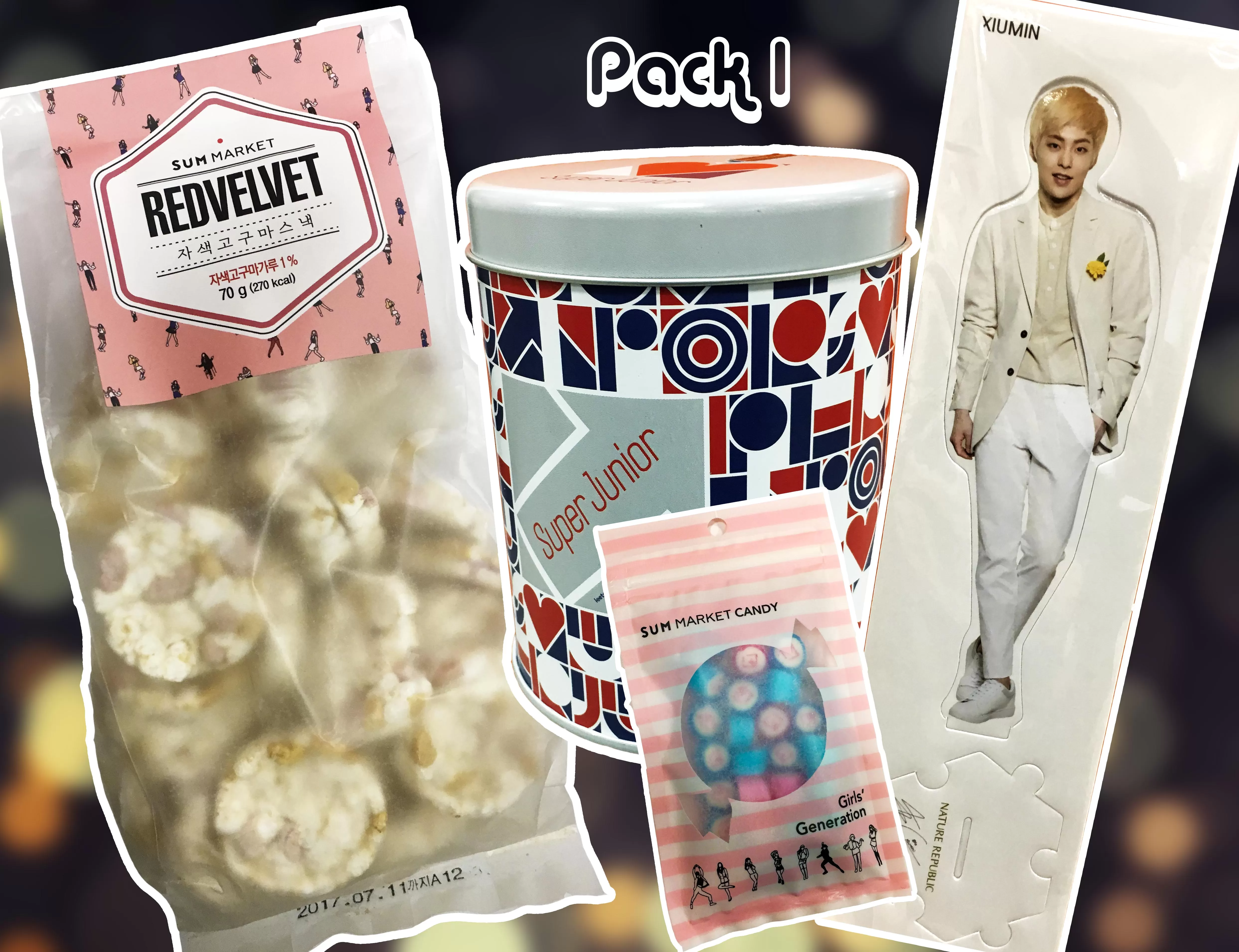 Pack 1: Galletas, caramelos, lata con canchita y decoración de Xiumin