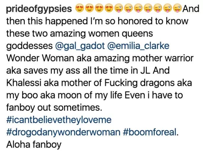“Y luego pasó esto. Estoy feliz de conocer dos increíbles mujeres y princesas. Mujer Maravilla, increíble mujer guerrera que me salva todo el tiempo en Liga de la Justicia y Khaleesi, madre de los dragones, la luna de mi vida”