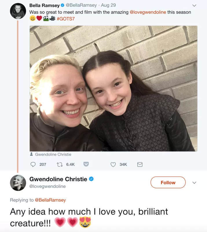 12. Gwendoline y Bella Ramsey (Lyanna Mormont) compartieron este lindo momento.