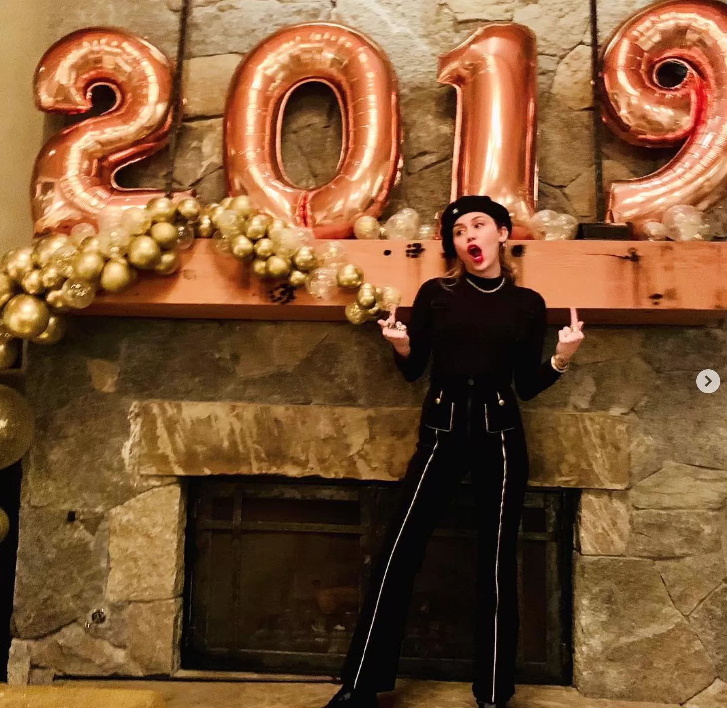 La recién casada, Miley Cyrus posó frente a una chimenea y globos con los números del nuevo año.