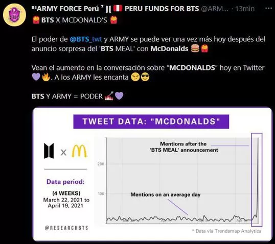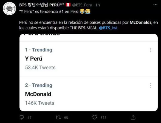Aunque Perú no forma parte de los 50 países que disfrutarán del menú inspirado en los chicos de BANGTAN, sus fieles ARMY alzaron la voz y volvieron tendencia el término “Y PERÚ”: