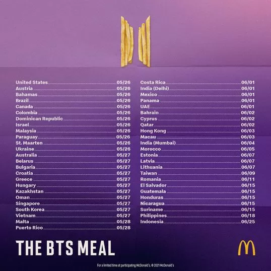 Según el post de McDonald’s en los países donde estará disponible el BTS Meal, su venta iniciará desde el 26 de mayo en algunos países.
