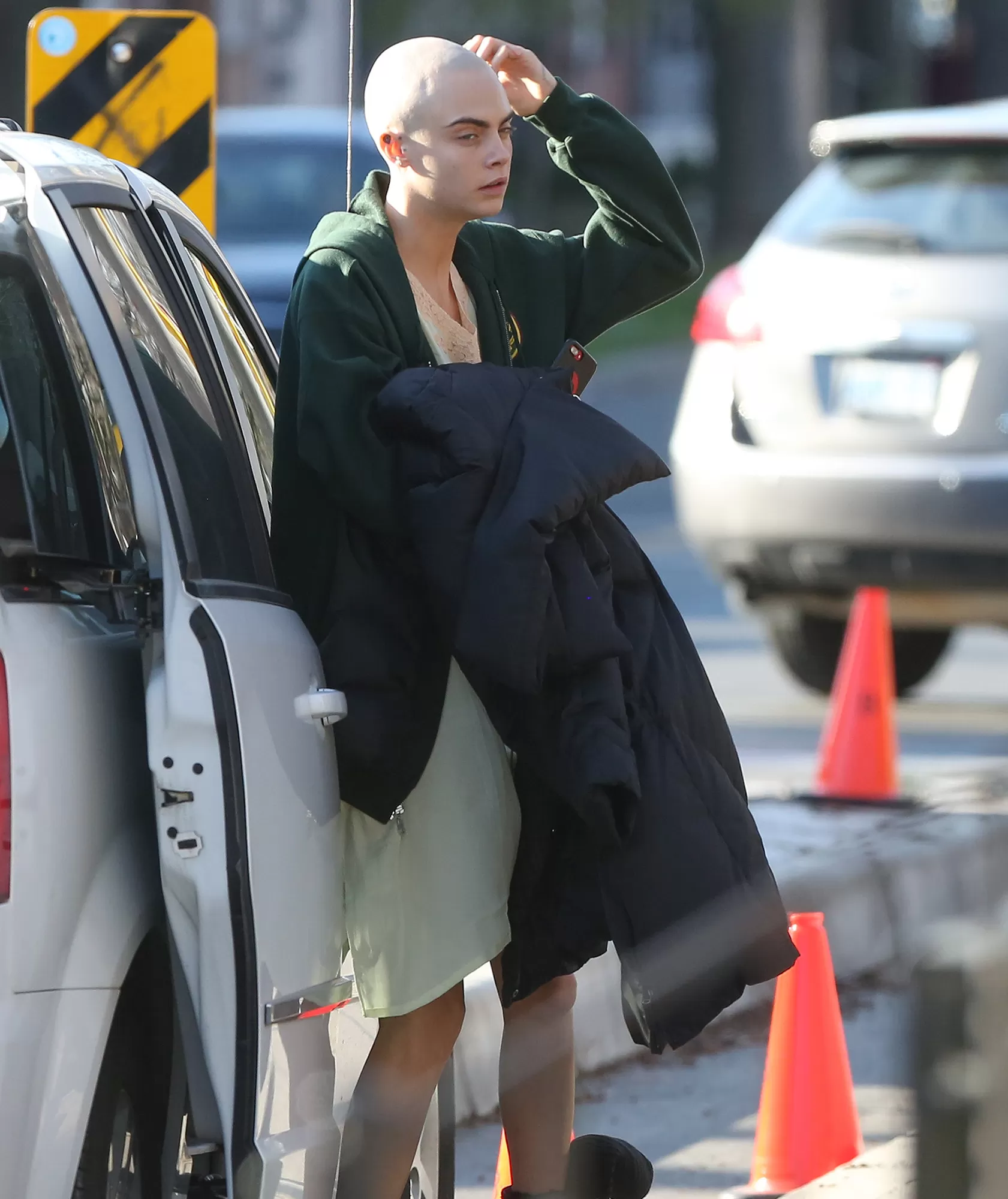 Después de ocultar su cabeza con una capucha durante el fin de semana, Delevingne debutó su look en el set en Toronto. Y la transformación lo estaba construyendo lentamente, pues apenas la semana pasada, la estrella cortó las puntas blancas-rubias y rosadas en pixie.
