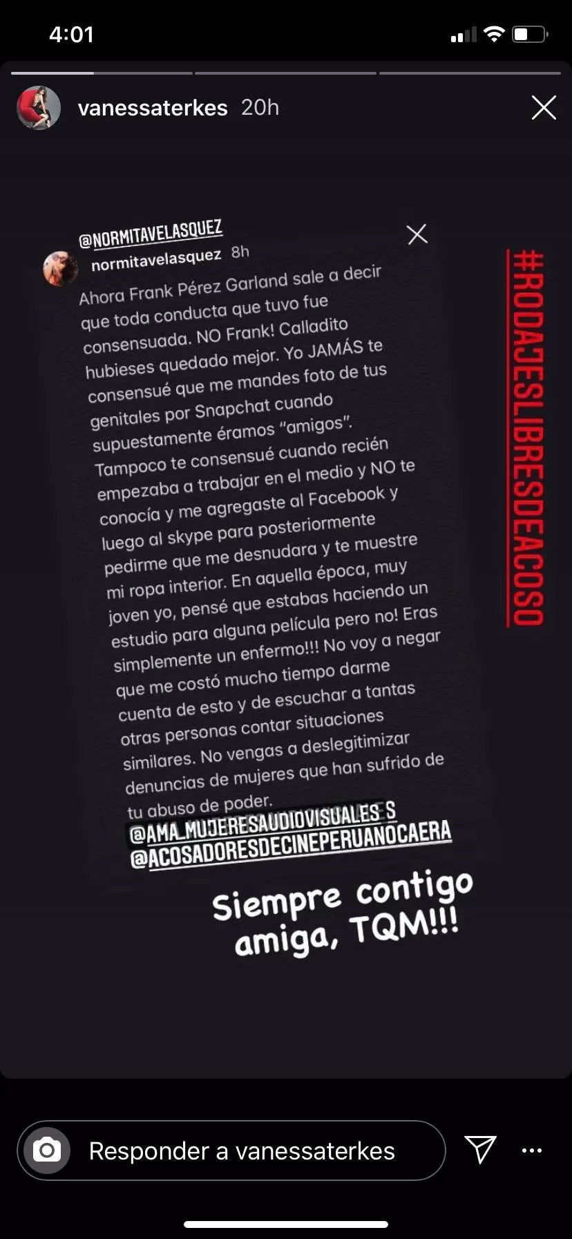 Si bien aquellas primeras denuncias que llegaron a la cuenta de Instagram @acosadoresdecineperuanocaera fueron realizadas de manera anónima (el espacio asegura ser seguro para las víctimas y prometen mantener su identidad en secreto), tenemos el relato de una de ellas que usó su propia cuenta de Instagram para hablar sobre lo sucedido. Se trata de la productora y directora Norma Velásquez quien escribió en sus historias: