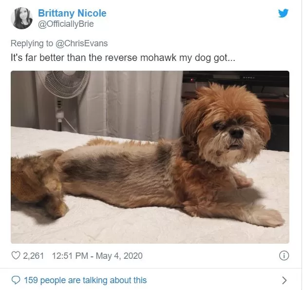 En una publicación en Twitter e Instagram, Evans explicó lo que sucedió cuando decidió darle un cambio de look a su perro: