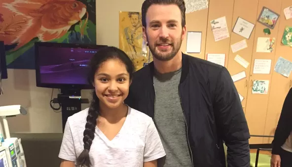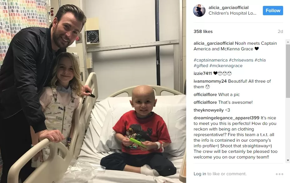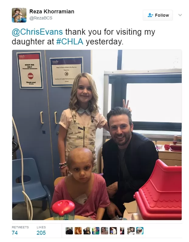 "[Chris Evans] gracias por visitar a mi hija en #CHLA ayer", escribió Reza Khorramian, madre de uno de los pacientes, en Twitter.