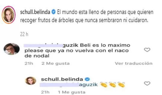 Recientemente, la mamá de la cantante y actriz mexicana Belinda, fue criticada en redes sociales después de que, en su cuenta de Instagram, publicara un video de su hija en Barcelona y en los comentarios respondiera con emojis de aplausos a un usuario que escribió: Beli es lo máximo, please que ya no vuelva con el naco de Nodal”, lo que la madre de la cantante parece apoyar.