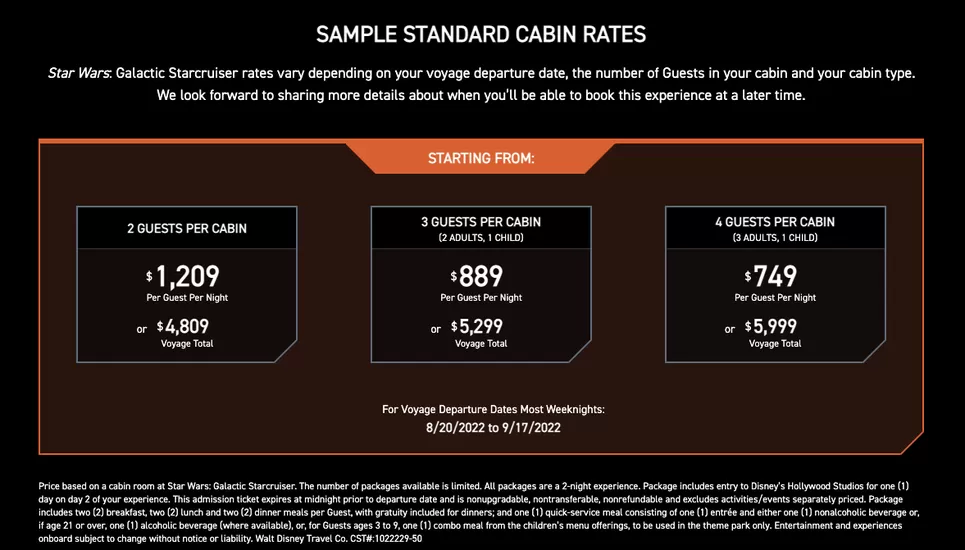A mediados del 2022, cualquier persona con suficiente dinero para gastar podrá (o al menos intentar) reservar una estadía en Star Wars: Galactic Starcruiser de Walt Disney World Resort, en Hollywood Studios, donde el, ya en uso, Star Wars, Galaxy's Edge se encuentra. En los detalles recientemente publicados, se describe como "en parte, un teatro inmersivo en vivo, en parte ambiente temático, en parte extravagancia culinaria y en parte juego de rol de la vida real". Ya sabíamos la mayor parte de eso; sin embargo, lo que no sabíamos era lo que iba a costar, y al parecer es bastante caro: un paquete con dos personas en una habitación (la única forma de quedarse) costará nada menos que $ 4,809; tres huéspedes a $ 5,299; y cuatro a $ 5,999.