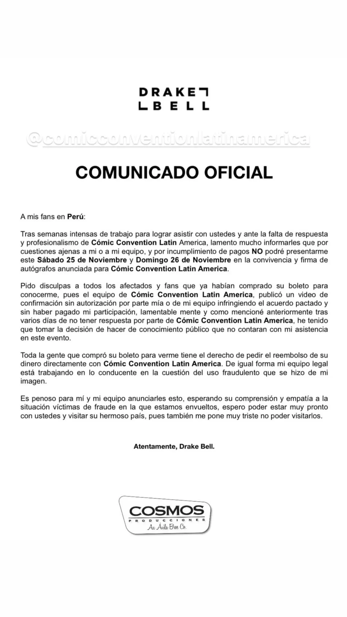 "Tras semanas intensas de trabajo para lograr asistir con ustedes, y ante la falta de respuesta y profesionalismo de la Cómic Convention Latin America, lamento mucho informarles que, por cuestiones ajenas a mí o a mi equipo, y debido al incumplimiento de pagos, no podré estar presente este sábado 25 de noviembre y domingo 26 de noviembre en la convivencia y firma de autógrafos anunciada. Pido disculpas a todos los afectados y fans que ya habían comprado su boleto para conocerme, pues el equipo de Cómic Conventon Latin America publicó un video de confirmación sin autorización por parte mía o de mi equipo, infringiendo el acuerdo pactado y sin haber pagado mi participación."