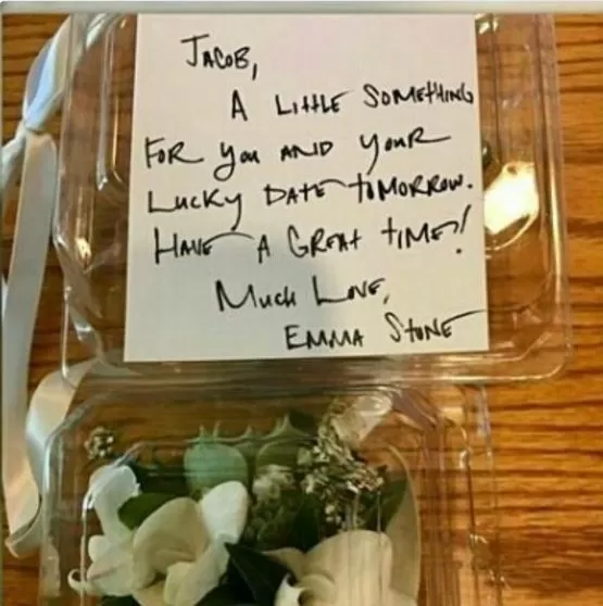 "Jacob, un pequeño regalo para ti y tu suertuda cita para mañana. ¡Que lo pases bien! ", escribió, firmando el mensaje con" mucho amor, Emma Stone."