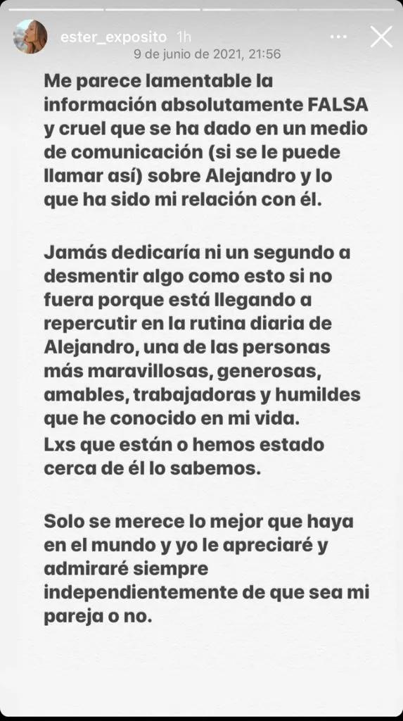 "Jamás dedicaría ni un segundo a desmentir algo como esto si no fuera porque está llegando a repercutir en la rutina diaria de Alejandro, una de las personas más maravillosas, generosas, amables, trabajadoras y humildes que he conocido en mi vida. Lxs que están o hemos estados cerca de él lo sabemos"