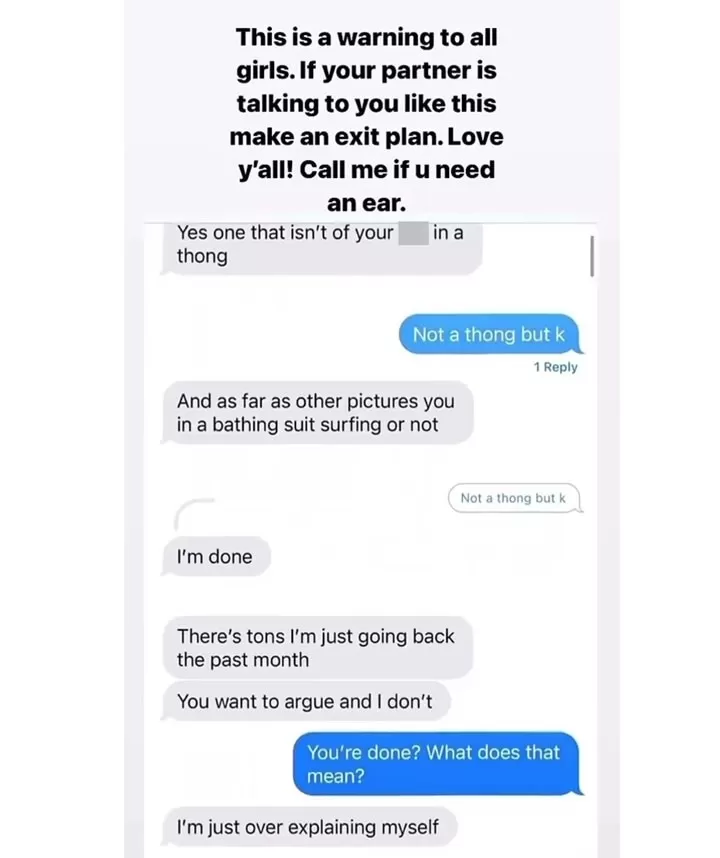 “Esta es una advertencia para todas las chicas. Si tu pareja te habla así, prepara un plan de salida. Llámame si necesitas que te escuche”