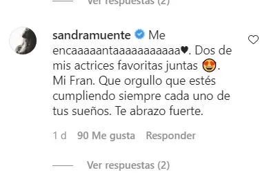 Sandra Muente: “Me encaaaaanta ♥️. Dos de mis actrices favoritas juntas. Mi Fran. Que orgullo que estés cumpliendo siempre cada uno de tus sueños. Te abrazo fuerte”, culminó la cantante.