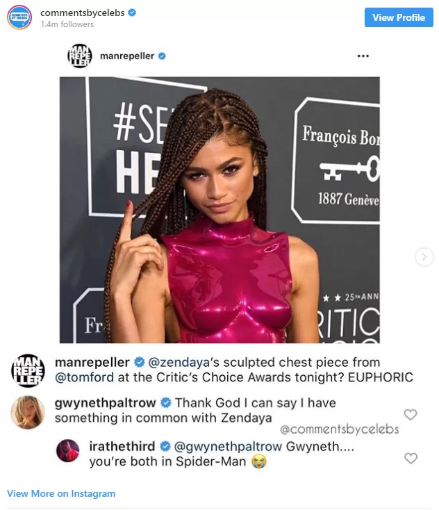 Paltrow recientemente llamó la atención al estar en la portada de la revista Harper’s Bazaar vistiendo un top acorazado diseñado por Tom Ford (que nos recordó un poco a su armadura de Endgame). Luego Zendaya apareció en la entrega de los Critics ’Choice Awards vistiendo lo mismo, haciendo que Paltrow comentara en Instagram:
