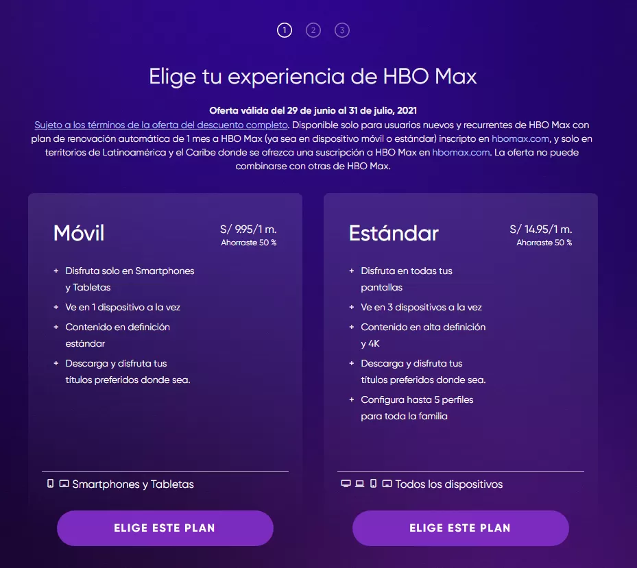 A pesar que la compañía ya había revelado el precio de sus planes, tanto móviles como estándar y de acuerdo a suscripción mensual, trimestral y anual, el día de hoy han sorprendido con otro anuncio y gran descuento. Resulta que el plan mensual con renovación automática es ofrecido con un 50% de descuento, lo que significa que si estás pensando pagar por el Plan Móvil te costará solamente S/.9.95 mientras que el Plan Estándar está en S/.14.95.