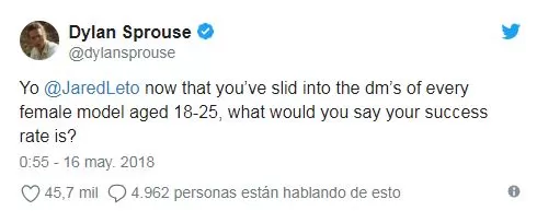 "Oye, @Jared Leto, ahora que has mandado mensajes privados a todas las modelos de entre 18 y 25 años, ¿cuál dirías que es tu porcentaje de éxito?".
