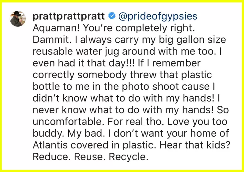 El comentario crítico de Momoa dividió a los fans, y algunas personas lo acusaron de ignorar la historia de las buenas acciones de Pratt. Más tarde se disculpó con una imagen de Instagram juntos.