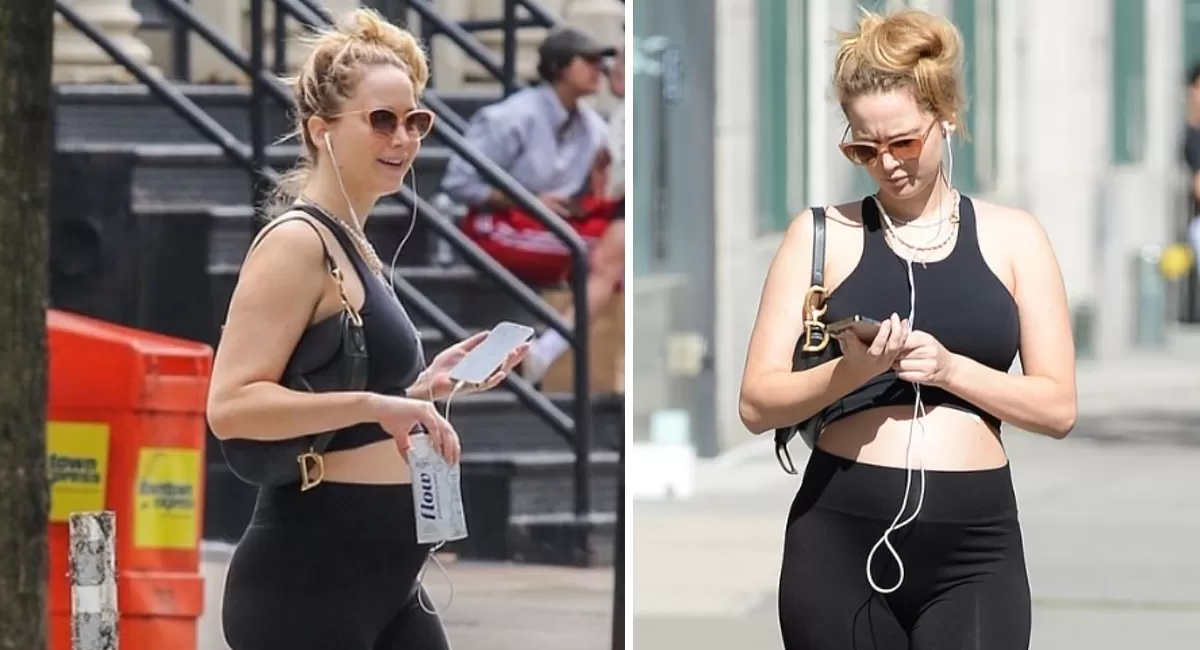 Todo parece ir viento en popa para Jennifer Lawrence, quien tiempo después de anunciar su embarazo a sus 31 años de edad, podemos verla en una etapa muy avanzada caminando de lo más normal por las calles de Nueva York, vistiendo un atuendo deportivo completamente negro mientras escuchaba música a través de auriculares.