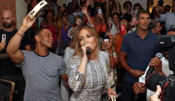 La puertorriqueña la estaba pasando bien con amigos cuando de pronto le llegó el micrófono y entonó el icónico himno de Gloria Gaynor, ‘I Will Survive’ con una pandereta de acompañamiento y luego se llevó la ovación del público con su famosísimo ‘Let’s Get Loud’. Ella luce risueña y divertida en un minivestido de lentejuelas.
