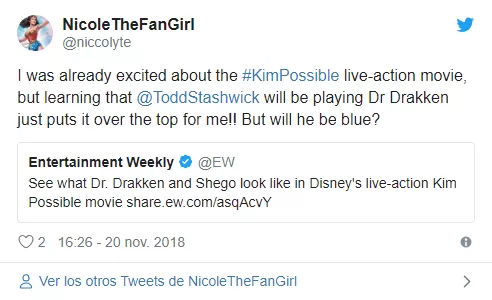 “Ya estaba entusiasmada con la película de acción en vivo #KimPossible, pero al enterarme de que @ToddStashwick interpretará al Dr. Drakken, ¡lo pone todo más emocionante! ¿Pero será azul?”
