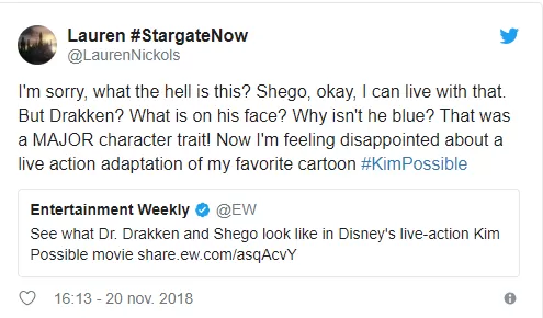“Lo siento, ¿qué diablos es esto? Shego, está bien, puedo vivir con eso. ¿Pero Drakken? ¿Qué hay en su cara? ¿Por qué no es azul? ¡Ese era un rasgo de su personaje muy importante! Ahora me siento decepcionado por una adaptación de acción en vivo de mi caricatura favorita #KimPossible”