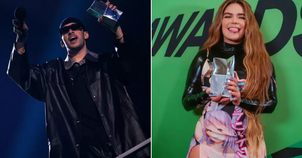 Bad Bunny ganó el premio al Artista más escuchado, y Karol G fue galardonada como Artista más escuchada: “Ese es el propósito de la gente que hacemos música...gracias por hacer que Tusa sea un himno, por todas esas chicas malas”, sostuvo la cantante colombiana.
