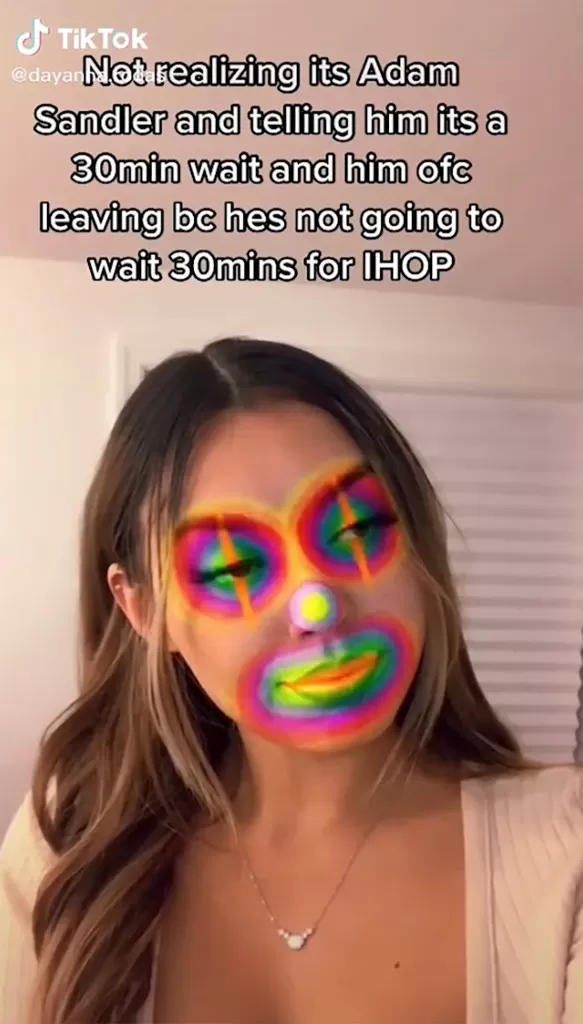 En el clip, la joven empieza el video con el famoso filtro de payaso debido a no haber reconocido al actor y lo acompaña con el texto: “sin darme cuenta de que es Adam Sandler, le dije que debía esperar 30 minutos, pero él se va porque no va a esperar”. En el video podemos ver claramente que se tratarían de imágenes de alguna cámara de seguridad, en donde podemos visualizar a Sandler con un acompañante, ambos con mascarilla, haciendo un gesto de disgusto, seguido de retirarse del establecimiento.