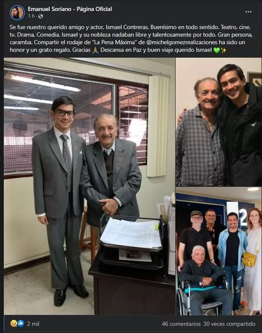 Y no solo quedó ahí. Gente del mundo del arte, como el actor Emmanuel Soriano, con quien Ismael Contreras compartió roles en la película, aún inédita, “La Pena Máxima”, se manifestaron también en redes: “Se fue nuestro querido amigo y actor, Ismael Contreras. Con su nobleza nadaba libre y talentosamente por todo. Gran persona, caramba. Compartir el rodaje de “La Pena Máxima” ha sido un honor y un grato regalo. Descansa en Paz y buen viaje querido Ismael”.