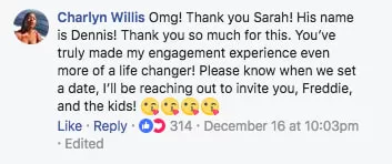"OPD! Gracias Sarah! Su nombre es Dennis. Muchas gracias por esto. Has hecho que mi compromiso sea una experiencia aún más importante. Quiero que sepas que cuando tengamos una fecha te haré llegar una invitación para ti, Freddie y los ninos!"