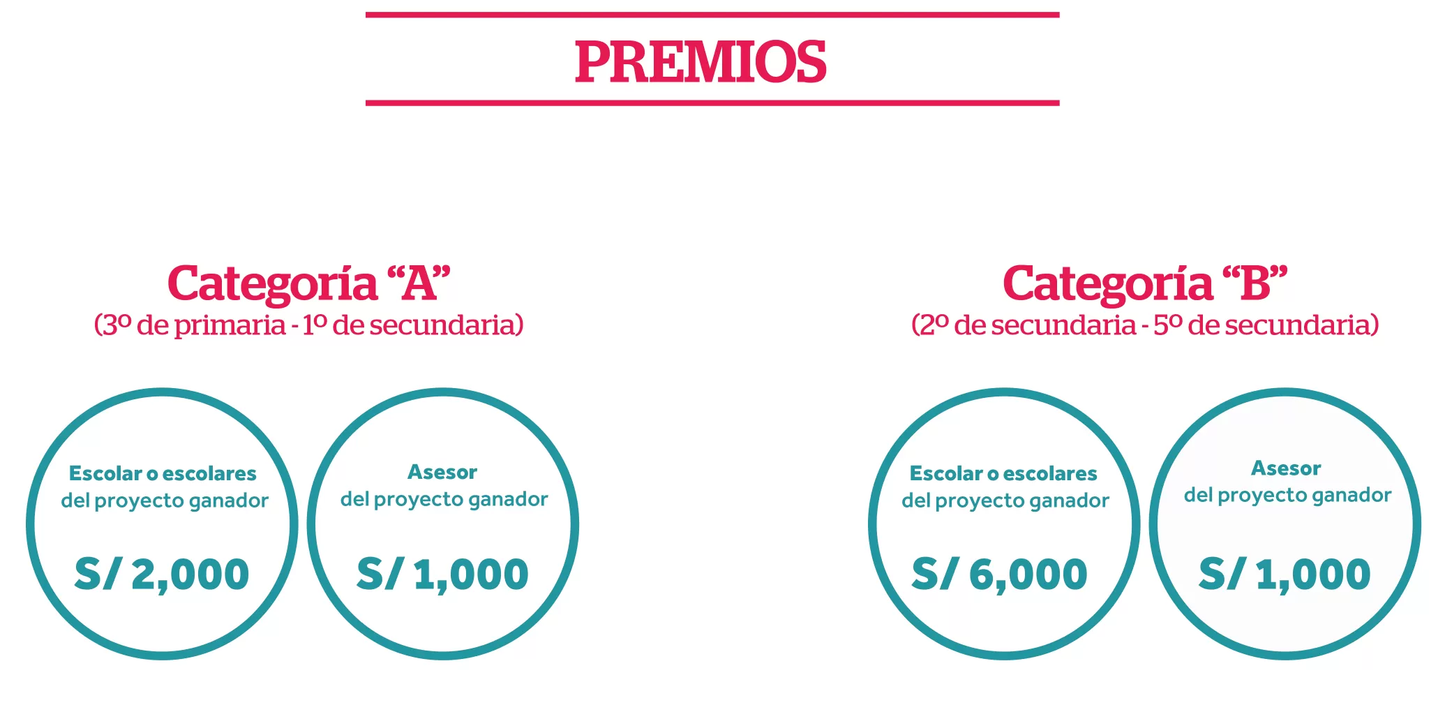Este concurso está dirigido a escolares de instituciones educativas públicas y privadas de todo el Perú, desde el tercer grado de primaria hasta el quinto año de secundaria. Ellos podrán postular ideas de nuevos productos, nuevos procedimientos o mejoras a los productos ya existentes que solucionen algún problema o necesidad en un área, sector, comunidad o población en particular.
