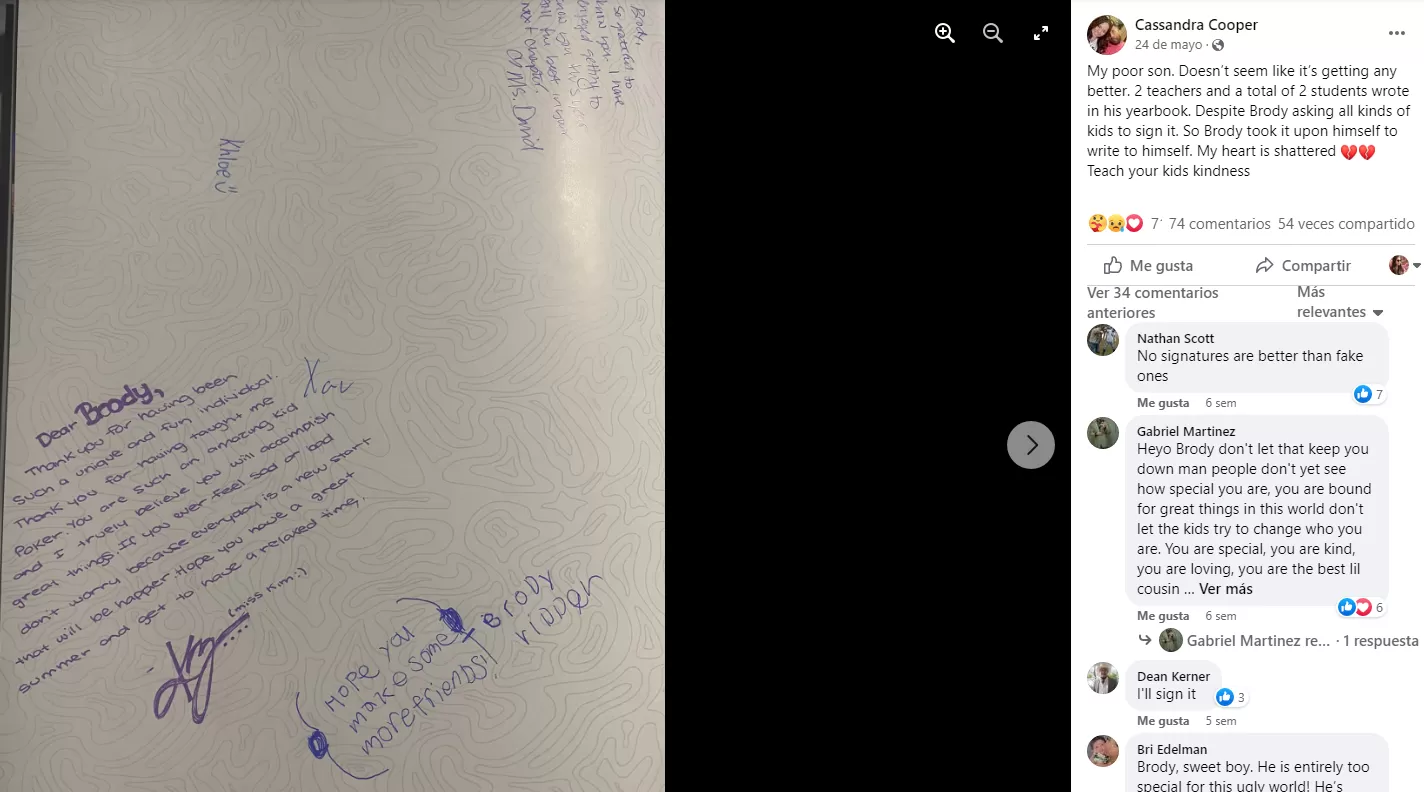 "Mi pobre hijo. No parece que esté mejorando. 2 maestros y un total de 2 estudiantes escribieron en su anuario. A pesar de que Brody le pidió a todo tipo de niños que lo firmaran. Así que Brody se encargó de escribirse a sí mismo. Mi corazón está destrozado 💔💔 Enseña bondad a tus hijos".