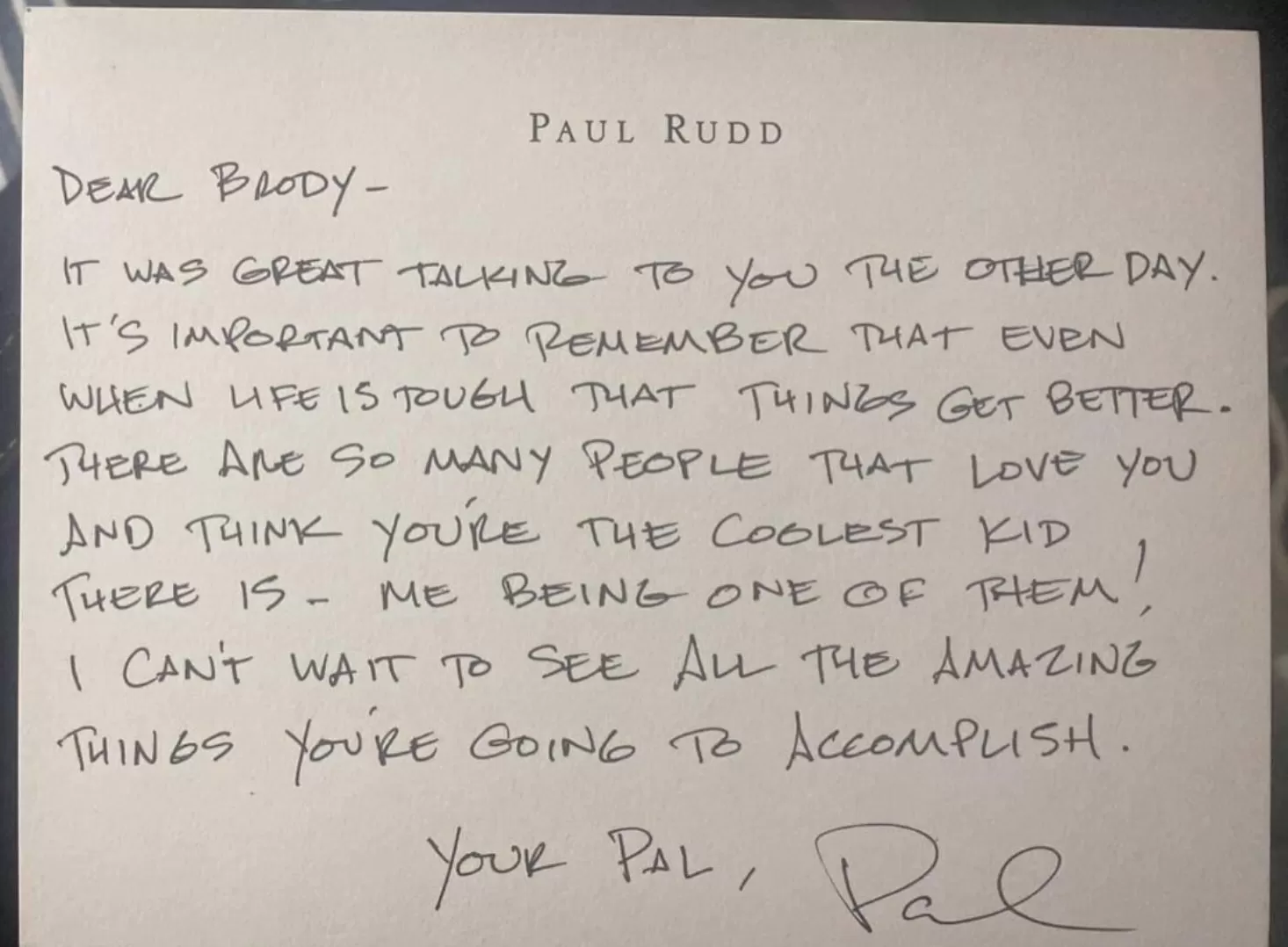 "Fue genial hablar contigo el otro día", escribió Rudd en la nota publicada por la madre del niño en las redes sociales. "Es importante recordar que incluso cuando la vida es difícil, las cosas mejoran. Hay tantas personas que te aman y piensan que eres el chico más genial que existe, ¡siendo yo uno de ellos! No puedo esperar para ver todos los cosas asombrosas que vas a lograr. Tu amigo, Paul".