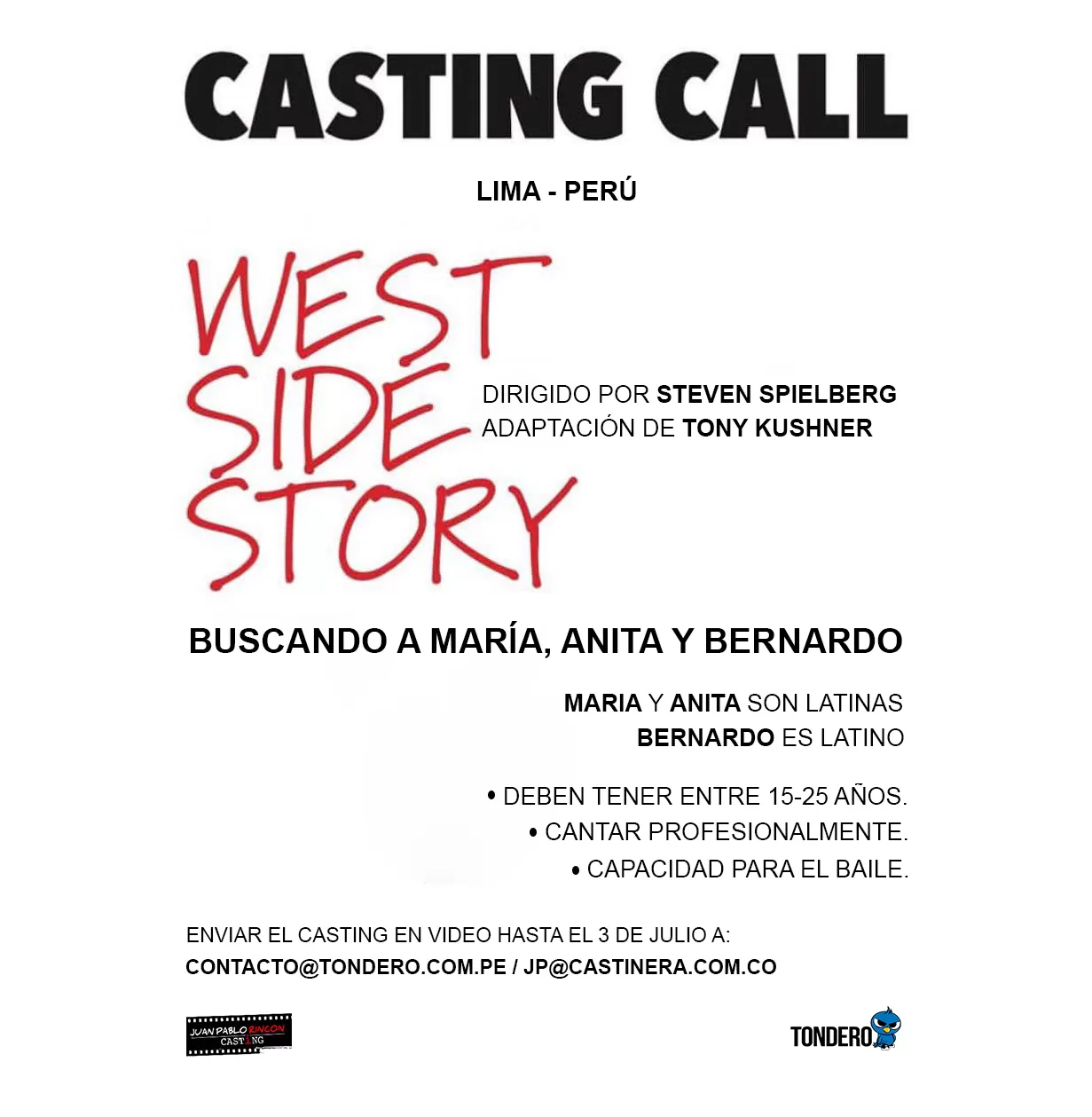 Tras confirmarse el remake del exitoso musical West Side Story a cargo de Steven Spielberg, la reconocida empresa “Tondero” apoyará toda la producción del casting de dicho proyecto en Perú. La búsqueda de los protagonistas estará a cargo del reconocido director de casting Juan Pablo Rincón, quien fue el responsable de la búsqueda y selección de talentos para importantes producciones como: "Narcos", "American Made" (con Tom Cruise) y "Loving Pablo" (con Penélope Cruz y Javier Bardem).