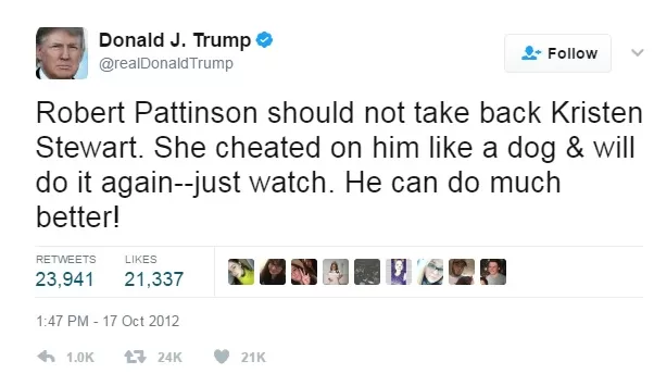 Sin embargo, en 2012, la actriz, que estaba saliendo con su coprotagonista Robert Pattinson en ese momento, fue criticada por la noticia de que había tenido un romance con el director de ‘Blancanieves y el Cazador’, Rupert Sanders, casado y con dos hijas. El escándalo hizo titulares y, extrañamente, llamó la atención del presidente Donald Trump que twitteó al respecto: