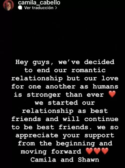 "Apreciamos mucho su apoyo desde el principio y en el futuro ❤️❤️❤️ Camila y Shawn", concluyó el comunicado.