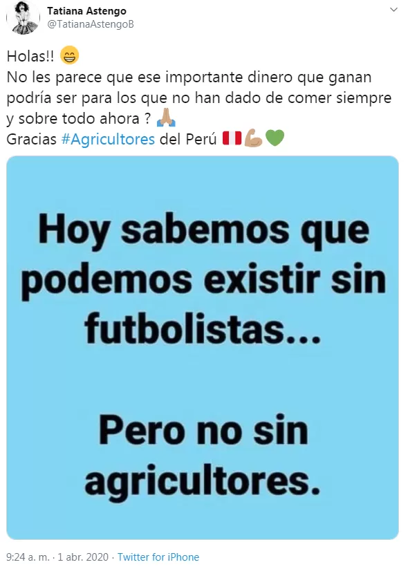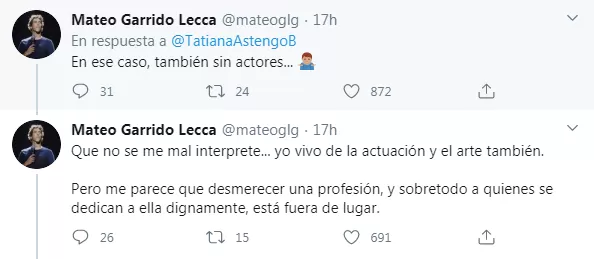 Sin embargo, minimizar a los futbolistas terminó siendo una total patinada por parte de la actriz pues si vamos a analizar cada profesión que no es vital en estos momentos, ya imaginamos que el rubro "entretenimiento" no queda tan bien parado (aunque claro, todo depende, por ahí quien pueda discutir diciendo que es parte necesaria para su salud mental). Pues bien, la gente no dejó de hacerle notar su falta de tacto respondiendo con muchísimos comentarios. Incluso hasta el (¿qué sería?¿influencer?) locutor radial Mateo Garrido Lecca, le respondió: