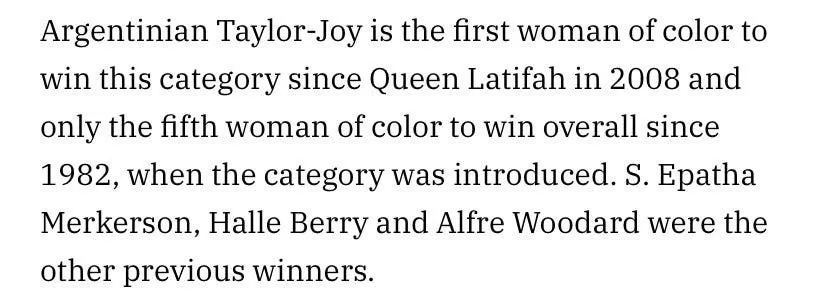 La nota original decía: "La argentina Taylor-Joy es la primera mujer de color en ganar esta categoría desde Queen Latifah en 2008 y sólo la quinta mujer de color en ganar la general desde 1982, cuando se introdujo la categoría. S Epatha Merkerson, Halle Berry y Alfre Woodard fueron las otras ganadoras anteriores".