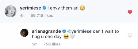 Por lo pronto, tanto Grande como BTS se han dado Follow mutuamente en Twitter y BTS compartió la foto que Ariana subió, lo que generó muchísimos comentarios, como el de la más joven de Red Velvet quien dijo que "sentía alguito de envidia" por sus pares de BTS. Ariana le respondió: "No puedo esperar a abrazarte un día".