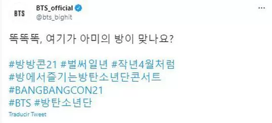 “Toc, toc. ¿Es la habitación de ARMY?”, expresa misteriosamente el post y añade estos mensajes a modo de hashtags: “Ya pasó un año”, “Tal como en abril del año pasado”, “Un concierto de BTS que puedes disfrutar desde tu habitación”. Como lo afirma el post, la plataforma de transmisión será YouTube, por lo que se deduce que este evento no tendrá costo de acceso.