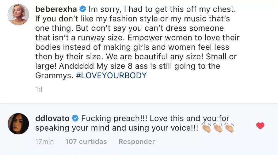 "He conseguido que me nominen en los Grammy y es lo más increíble que me ha pasado. Mi equipo contactó a algunos diseñadores y muchos de ellos no quieren vestirme porque soy demasiado grande. Literalmente, dicen 'muy grande’. Si una talla seis u ocho es demasiado grande, entonces no sé... Entonces no quiero llevar su puto vestido. Porque es una locura. Porque estás diciendo que todas las mujeres del mundo que tienen más de una talla ocho no son hermosas y no pueden llevar sus vestidos. A toda la gente que dice que soy muy grande: no quiero llevar sus putos vestidos."
