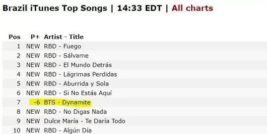 De igual manera, en Brasil, uno de los territorios donde RBD gozó de mayor popularidad, las canciones de la banda mexicana desplazaron el tema 'Dynamite' de BTS, logrando que baje a la séptima posición en el chart iTunes. Los seis primeros lugares pertenecen a RBD. De igual forma en el H