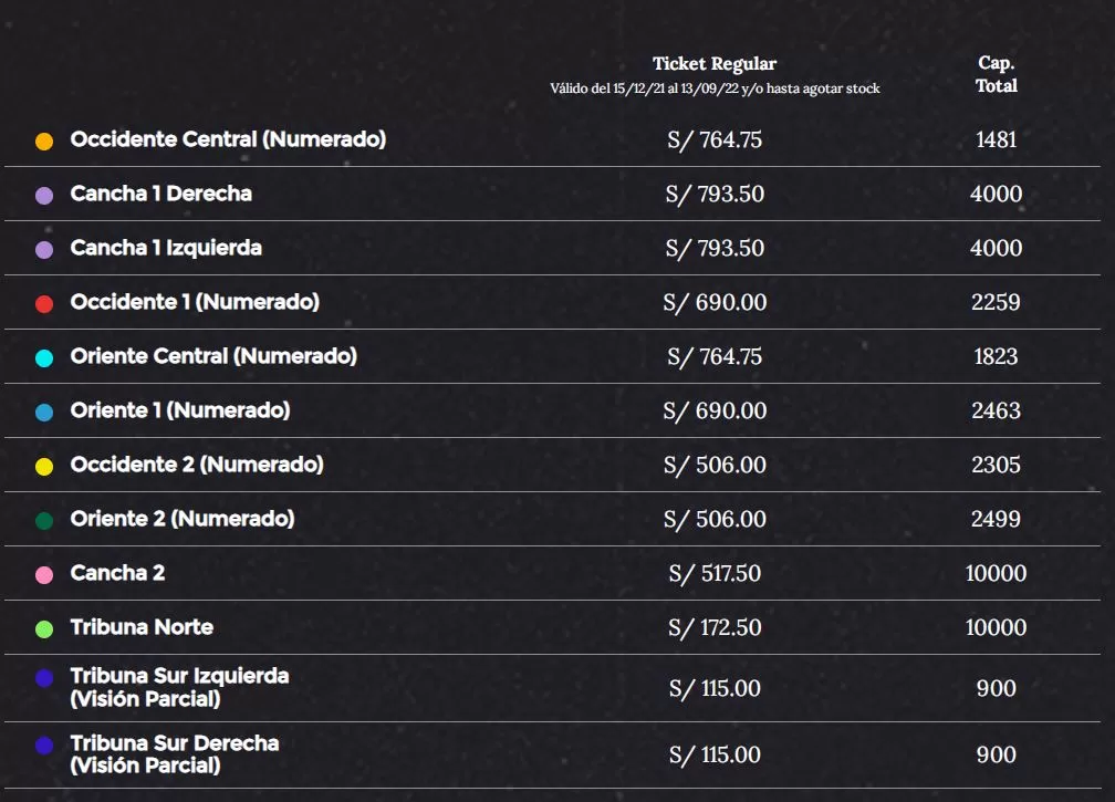 De acuerdo a la información compartida en la misma página de venta de entradas, los precios oscilan entre los S/. 793.5 para la primera zona de Cancha, hasta los S/.115 soles para la zona de Tribuna Sur.