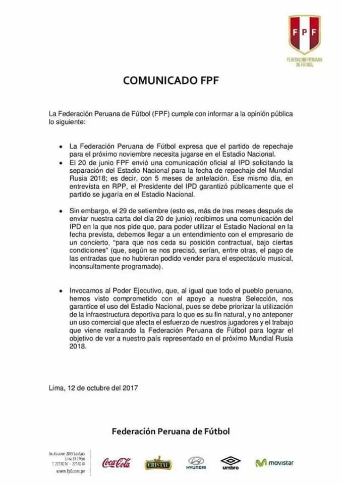 "Tal como hemos venido indicando, nuestra empresa cuenta con un contrato de alquiler firmado con el IPD desde hace varios meses. A la fecha, no hemos recibido propuesta alguna de mudanza de parte del IPD, ni de la Federación Peruana de Fútbol". - responde la empresa ante la controversia en Facebook.