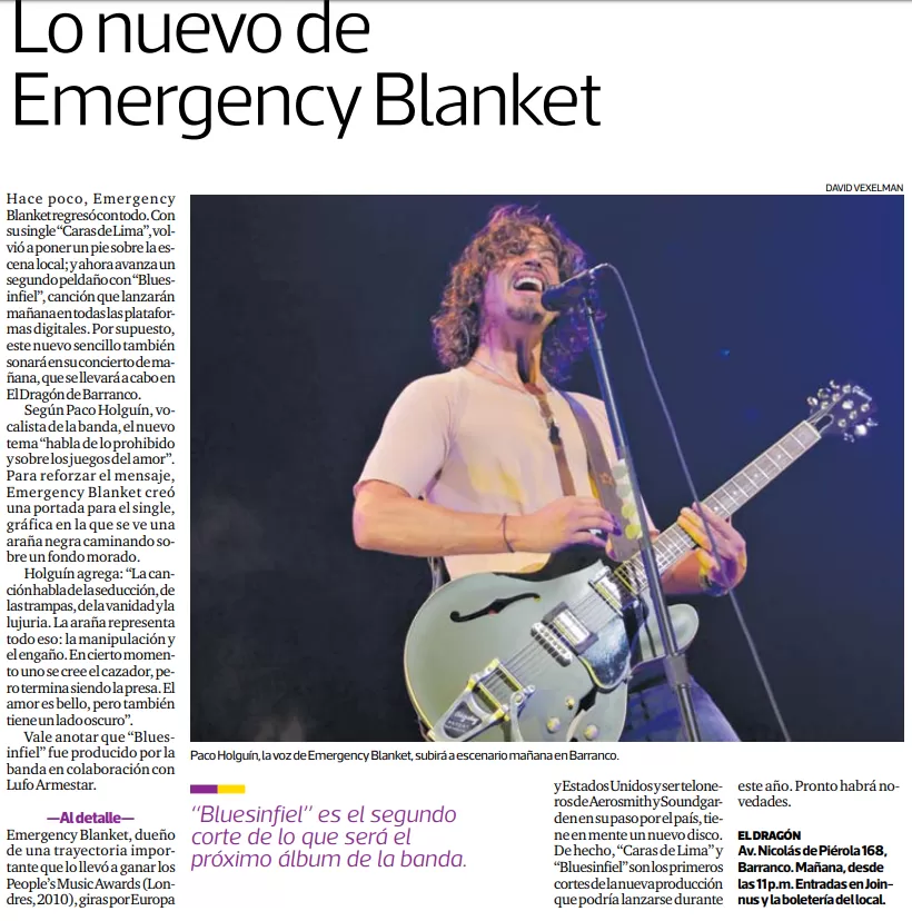 Si eres de escuchar música "MADE IN PERÚ" pues seguramente te has topado con la banda Emergency Blanket (quienes vale decir ya han desfilado por Cinescape en su momento). Pues bien, el vocalista de la banda, Paco Holguin, tomó su cuenta de Facebook para compartir una publicación muy interesante, perteneciente al diario El Comercio, donde acompañaban la nota dedicada el día de hoy a la banda con una imagen del fallecido CHRIS CORNELL!