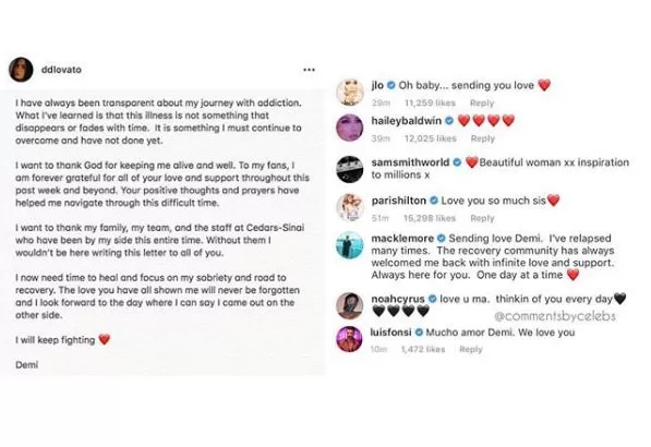 "Siempre fui transparente sobre la adicción que tengo. Lo que he aprendido es que esta enfermedad no desaparece, es algo con lo que tengo que luchar. Quiero agradecer a Dios por mantenerme viva y bien. Para mis fans, estoy eternamente agradecida por todo su amor y apoyo durante la última semana. Sus pensamientos positivos y oraciones me han ayudado a navegar en este momento difícil. Ahora necesito tiempo para sanar, centrarme en mi sobriedad y empezar la recuperación. Nunca olvidaré todo el amor que me han mostrado. Seguiré luchando".
