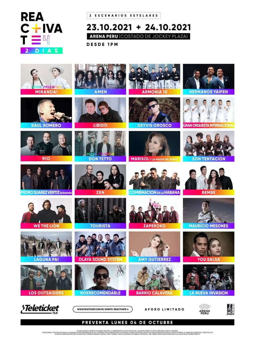 La cuarta edición del Festival Reactívate se llevará a cabo este 23 y 24 de octubre en la Arena Perú de Surco y como para encabezar el elenco, la producción ha invitado a los argentinos 'Miranda!' y los colombianos 'Don Tetto' para ser las estrellas internacionales del cartel.