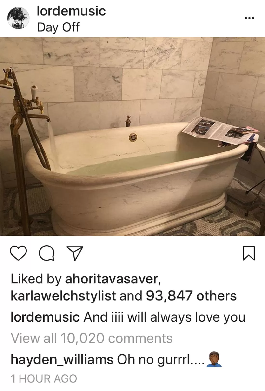El día de ayer, la cantante Lorde compartió una foto en Instagram de una bañera con una descripción: “and iiiiiiiiii will always love you”, letra de “I Will Always Love You” la canción de Dolly Parton que se hizo famosa por Whitney Houston, quien falleció en el 2012 por ahogarse en una bañera. Tres años más tarde, su hija, Bobbi-Kristina Brown, también fue encontrada en una bañera y permaneció en coma durante casi seis meses hasta su muerte en julio de 2015.
