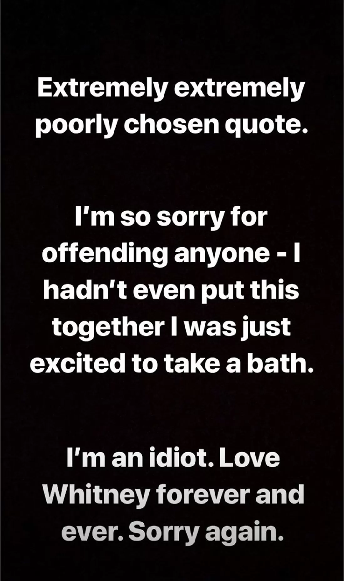 "Cita extremadamente mal elegida. Lo siento por ofender a alguien, ni siquiera había armado esto, estaba emocionada de tomar un baño. Soy una idiota. Amo a Whitney. Lo siento de nuevo."
