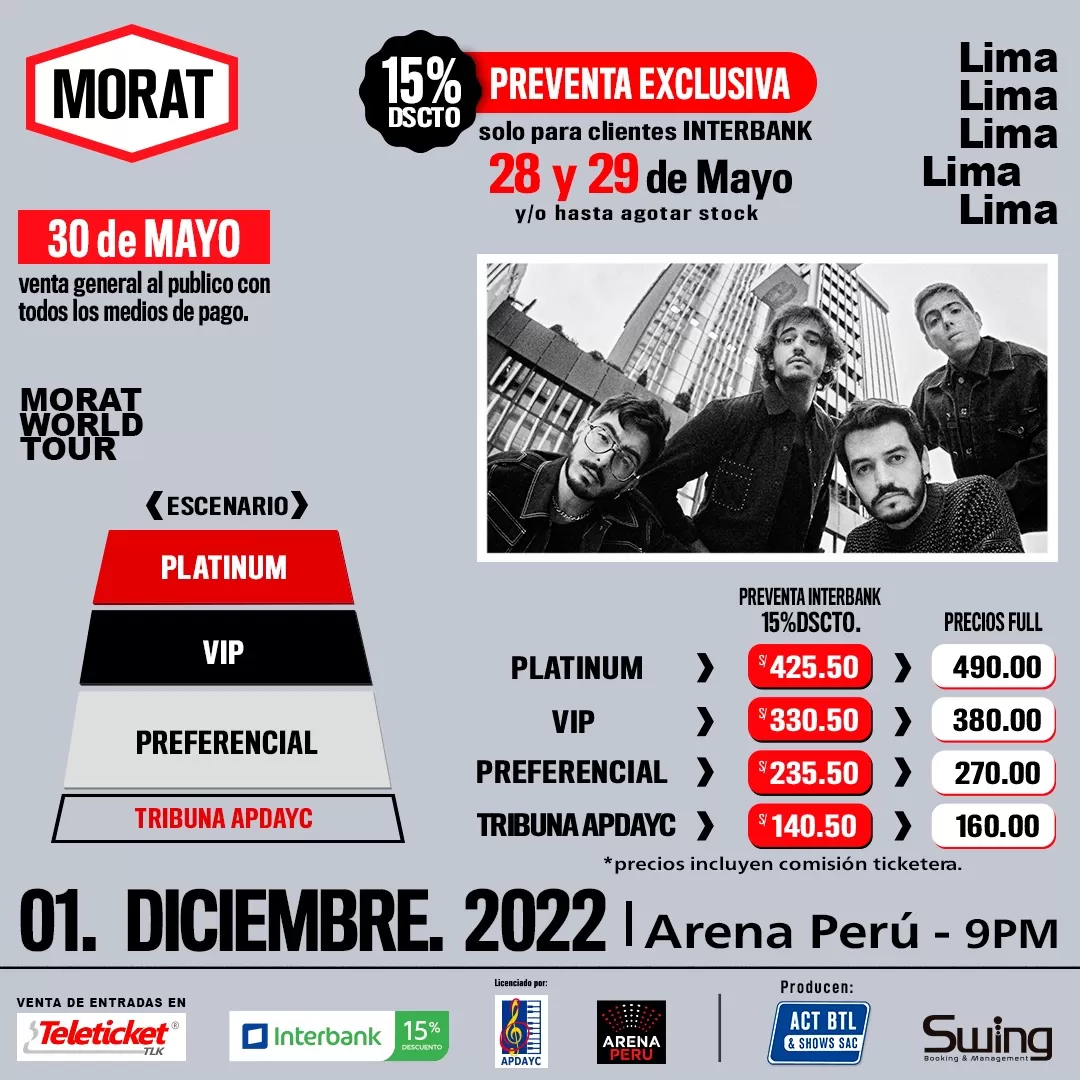 Morat llega en su mejor momento, con éxitos rotundos como No se va, Besos en Guerra, Cuando Nadie Ve, Llamada perdida o Porfa no te vayas; todos temas infaltables en este encuentro con el público peruano. Actualmente, Morat acaba de presentar su más reciente single ‘Paris’ junto a Duki, un adelanto de lo que será su nuevo trabajo discográfico.