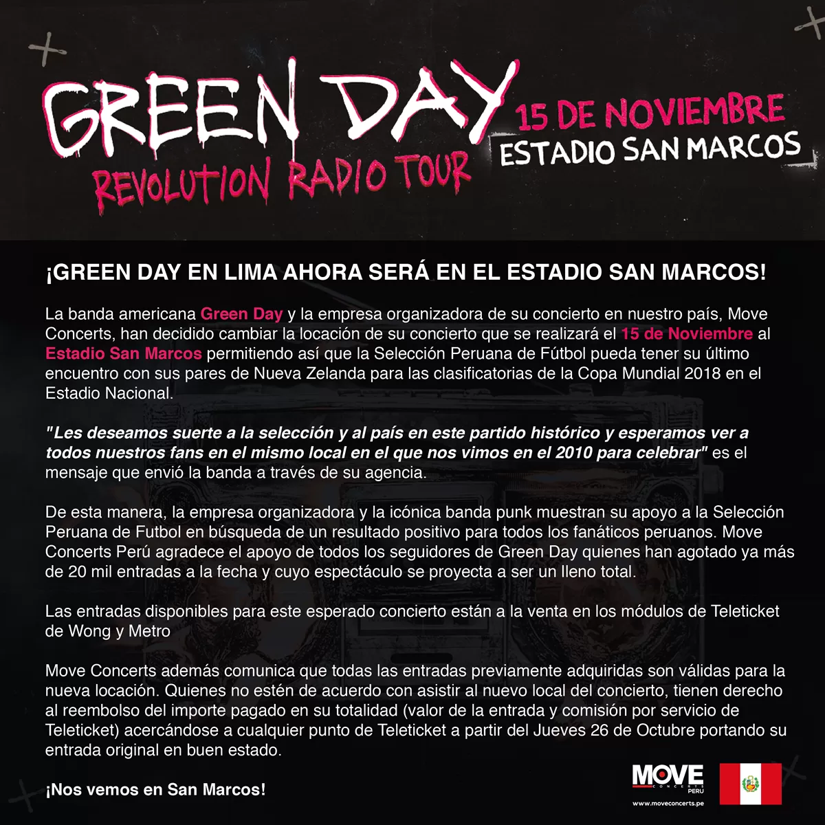 Después de un arduo debate en las redes sociales, la empresa Move Concerts y el IPD llegaron a un acuerdo respecto al concierto de Green Day, programado el 15 de noviembre originalmente en el Estadio Nacional. Como la fecha tenía un cruce con el partido de la selección se ha anunciado ya de manera oficial qué será del destino del recital.